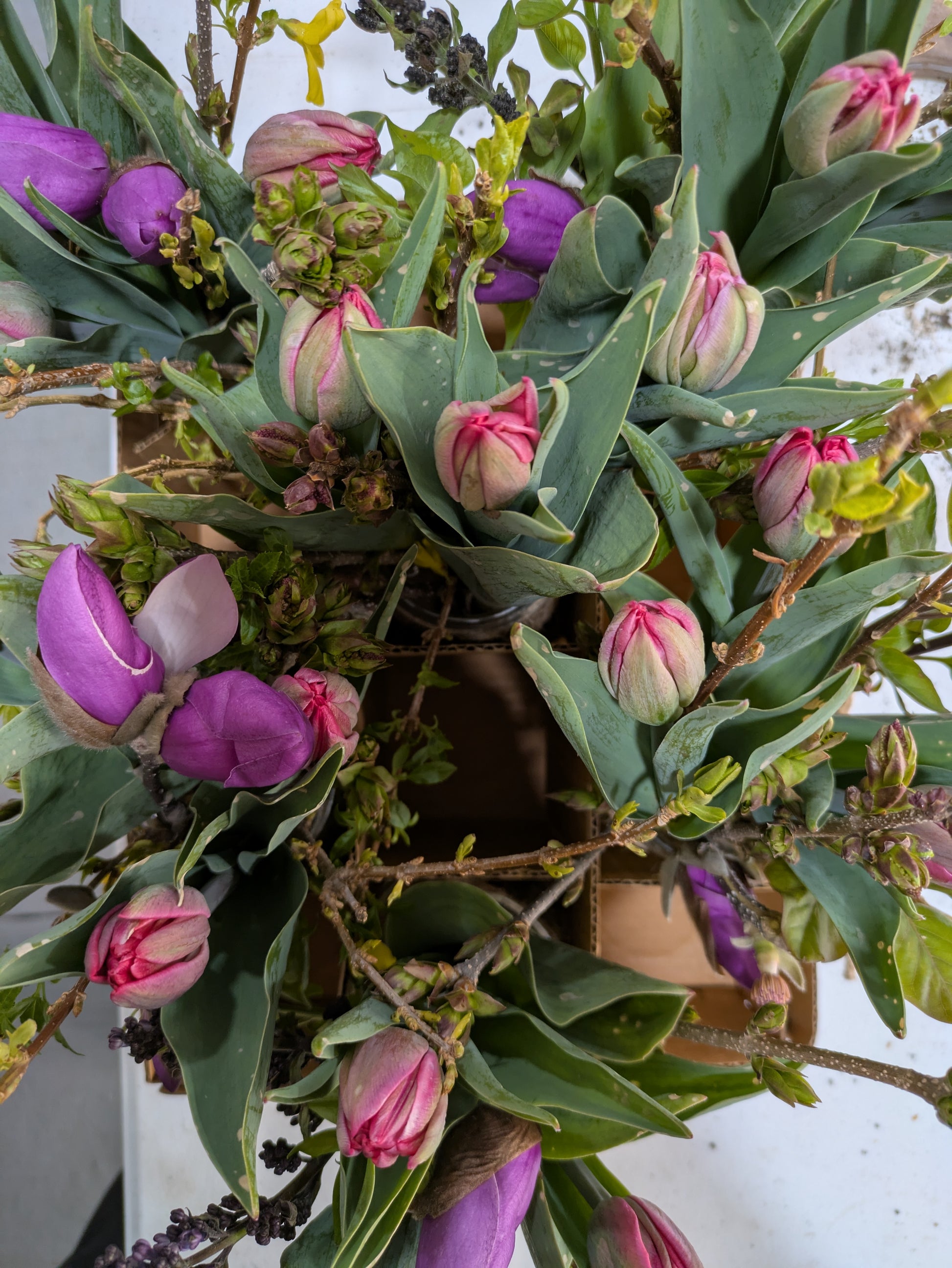 A bouquet of fresh, locally-grown blooms arranged in a glass jar.