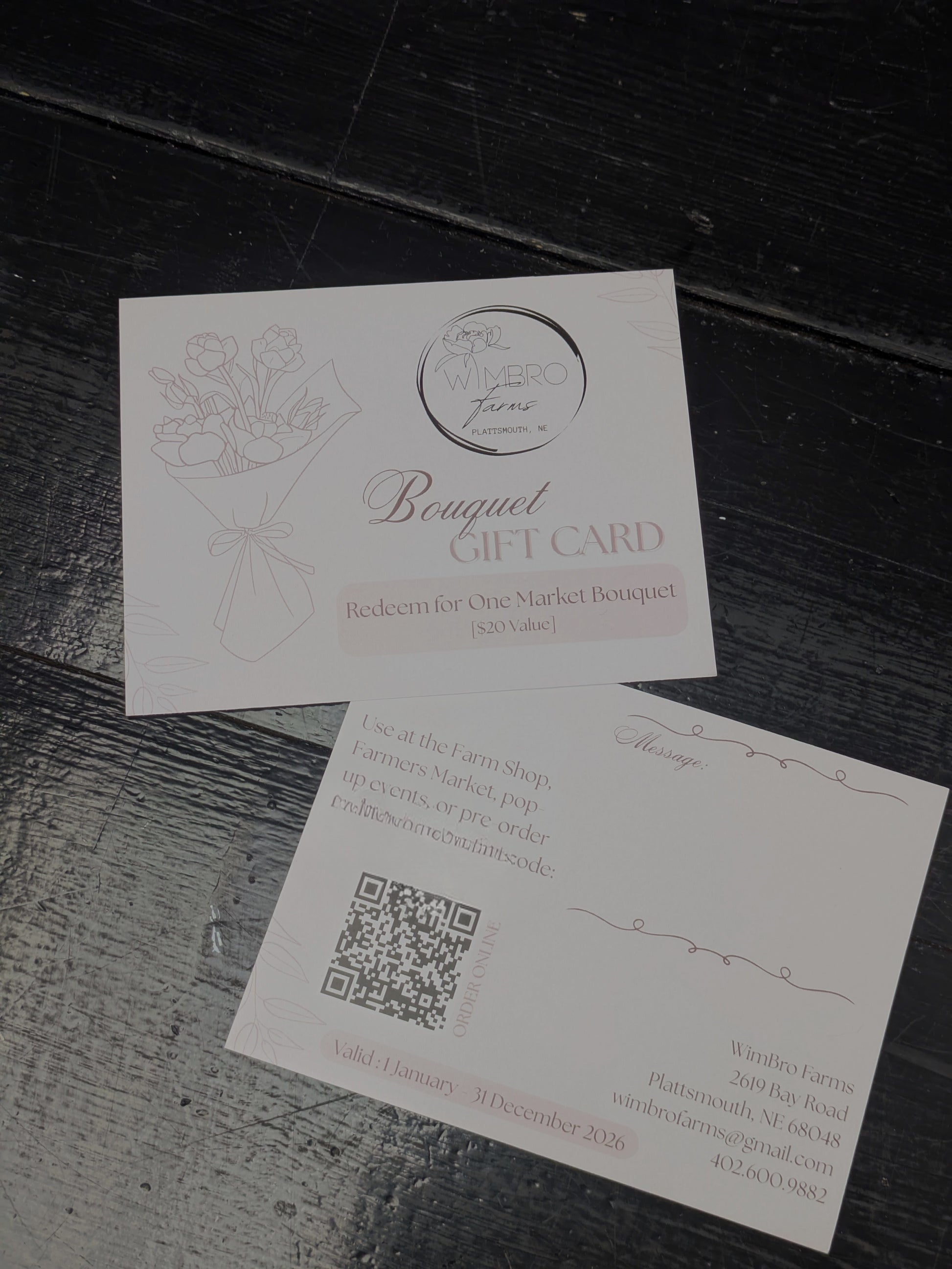 Each certificate is valid for a WimBro Farms Market Bouquet with a value of $20. It can be redeemed at our farm store, Plattsmouth community market, any of our vendor events, or in our online store for farm pick up using the code printed on the certificate (pre-order required for this option).