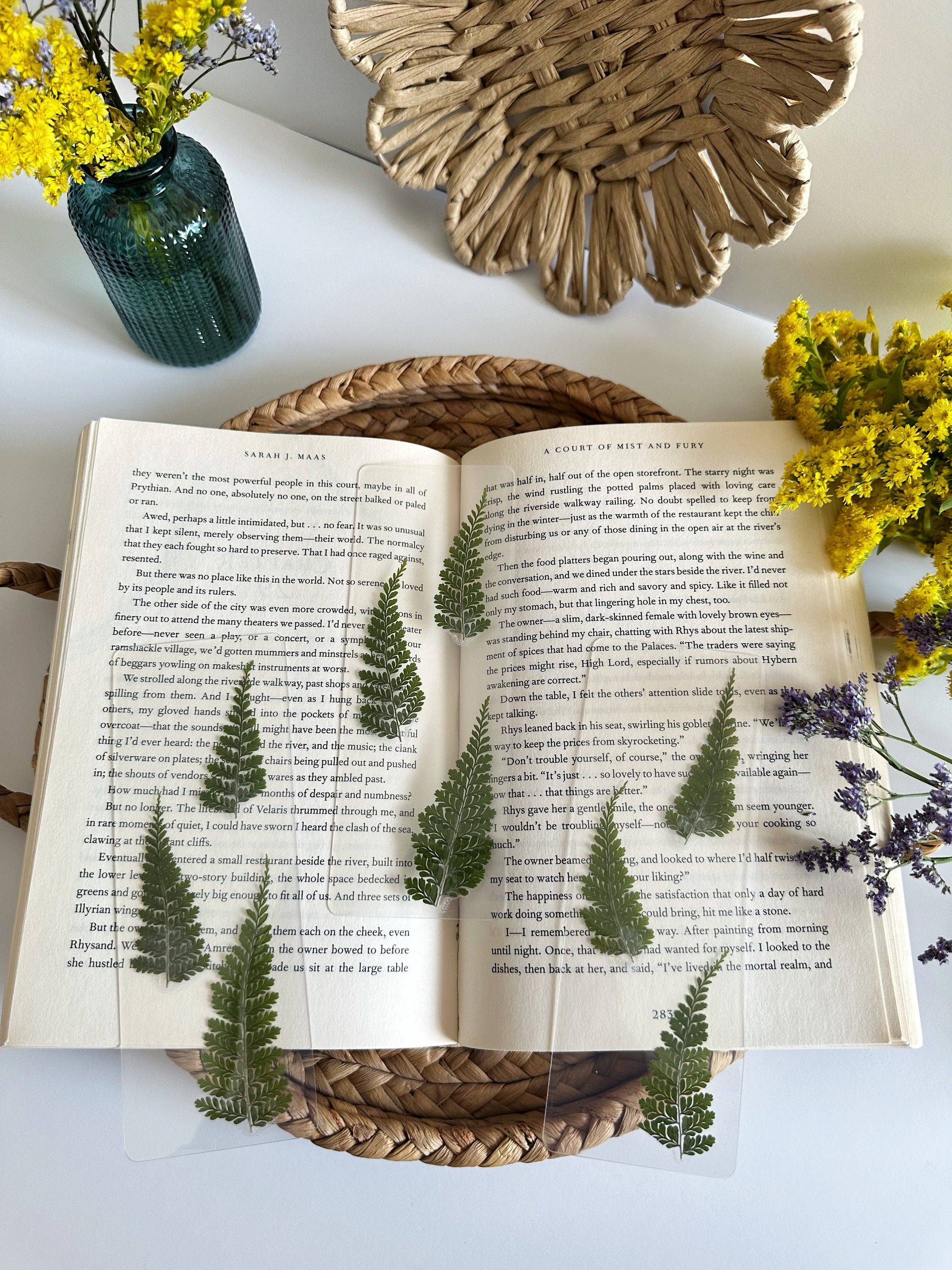 handmade, whimsical, fern bookmarks. these bookmarks are composed of real, pressed and dried fern leaves. ✿ the leaves are carefully arranged by Grace and then sealed and laminated in 10ml thick laminating pouches. ✿ laminate material is thinner than resin, think a sturdy, thicker plastic-feel. this material preserves the flowers' vivid colors, as well as protects the spines of your books. ✿ bookmarks are approximately 2" x 6". ✿