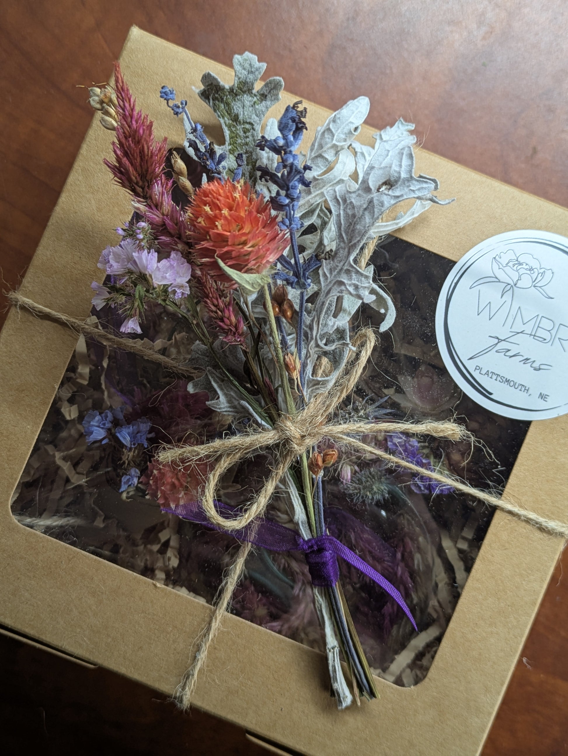 An adorable mini bouquet to add pizazz to your gifting! Dried flowers, wrapped with a purple organza ribbon.