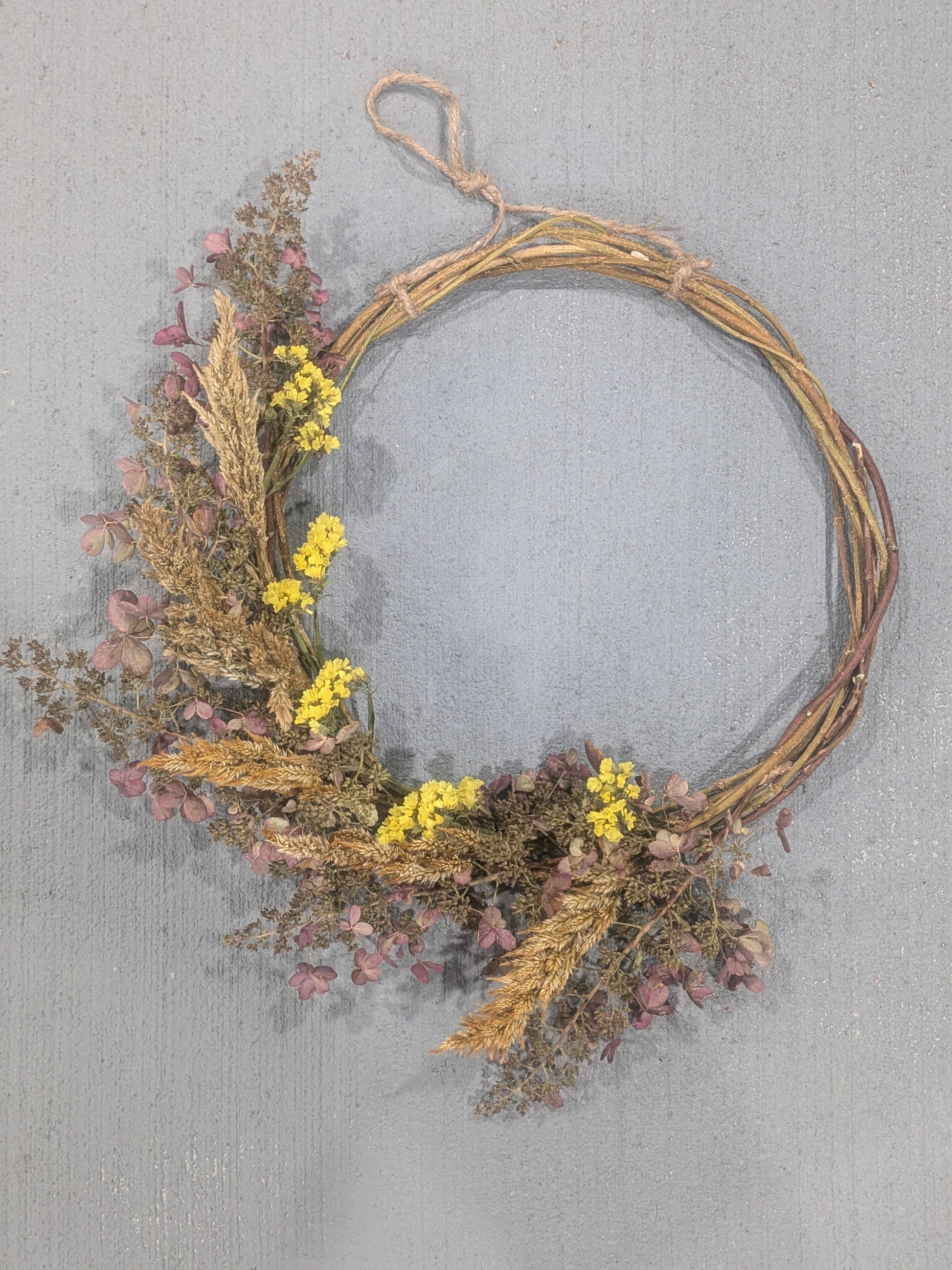Hand-woven wreath. Woven from forsythia branches and adorned with dried flowers. Wreath base and flowers grown and dried on our farm.